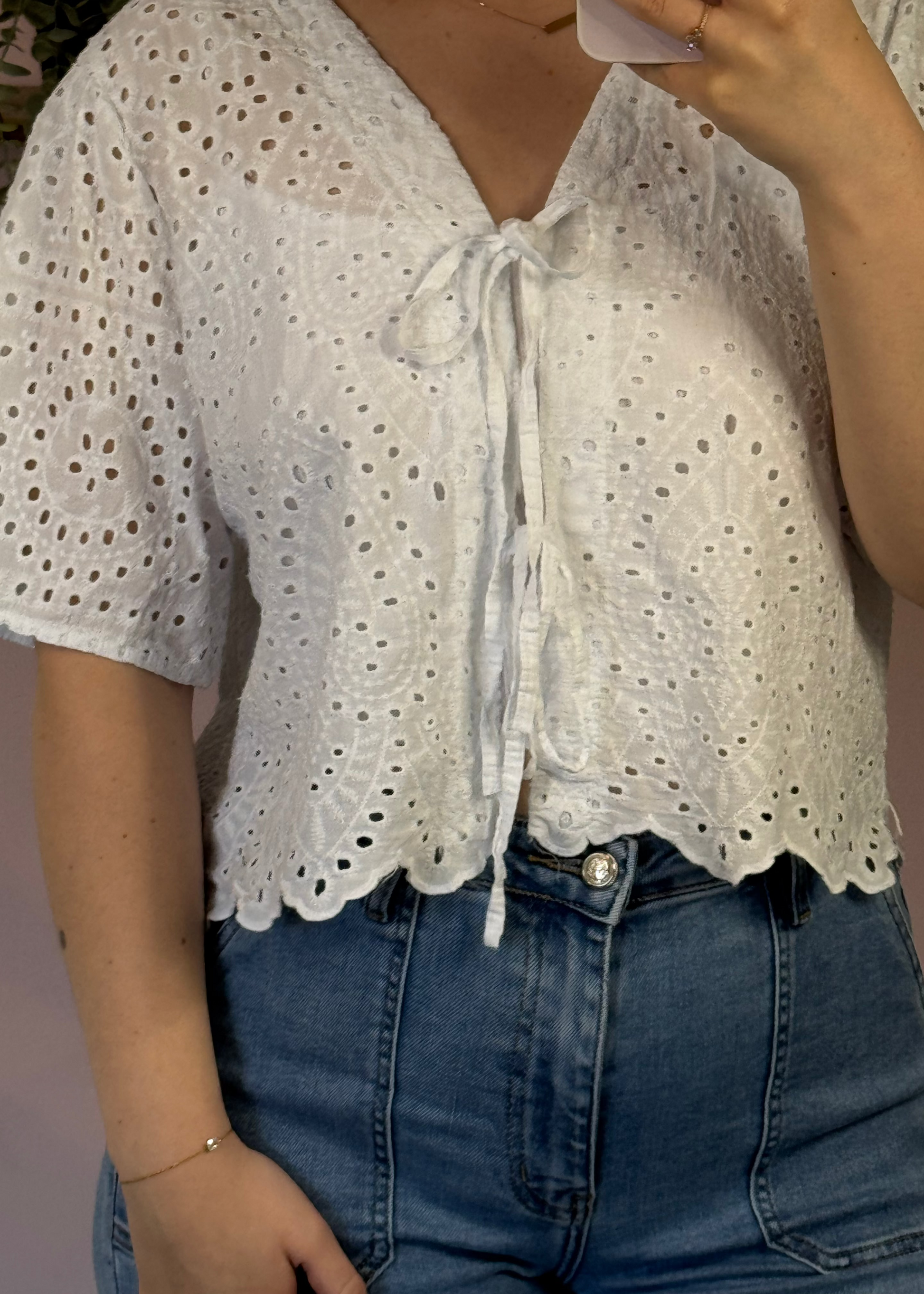 Fraîche et lumineuse, la version blanche met en valeur la broderie anglaise pour un look romantique et estival. Parfaite avec un jean ou une jupe fluide.