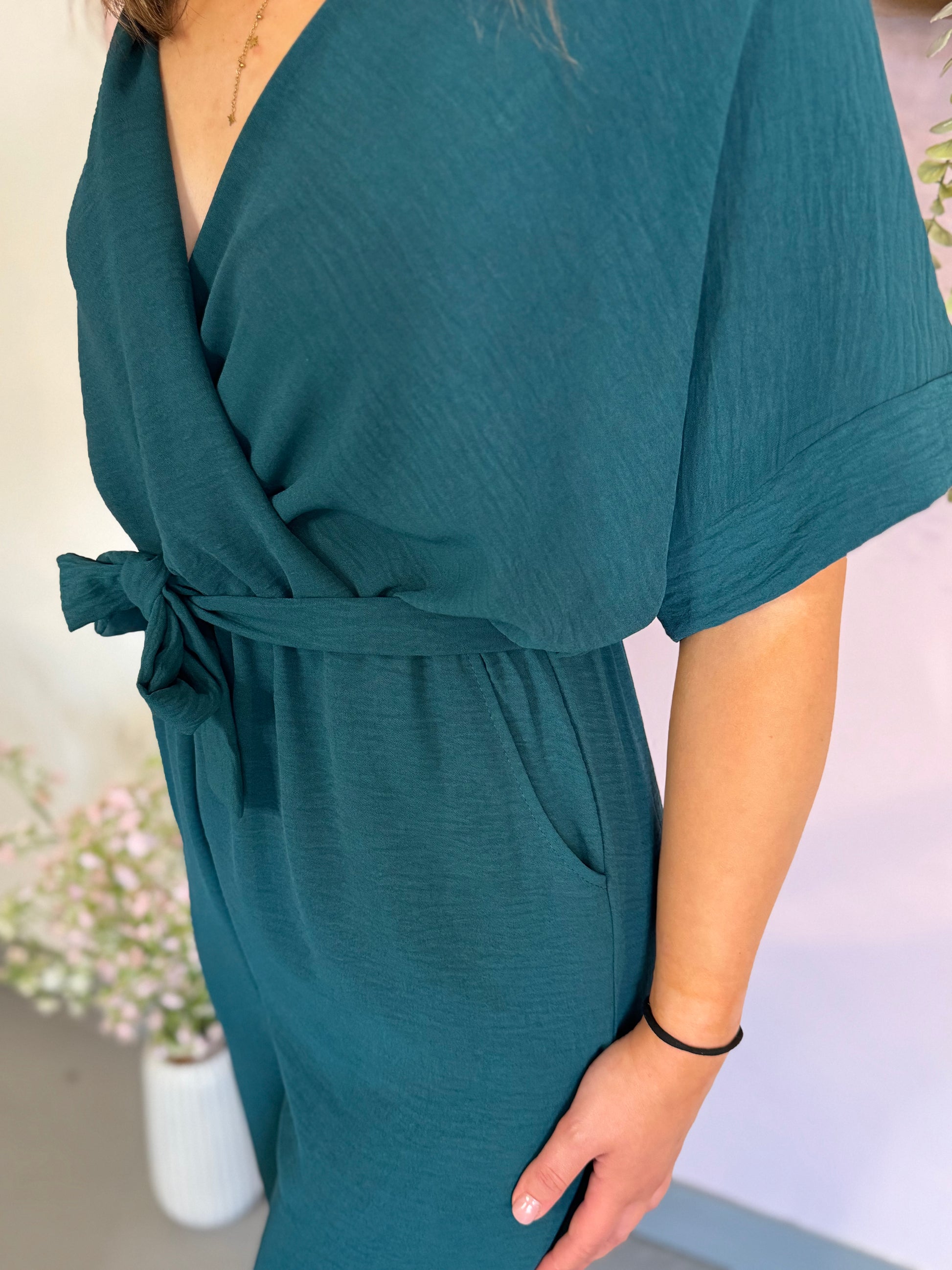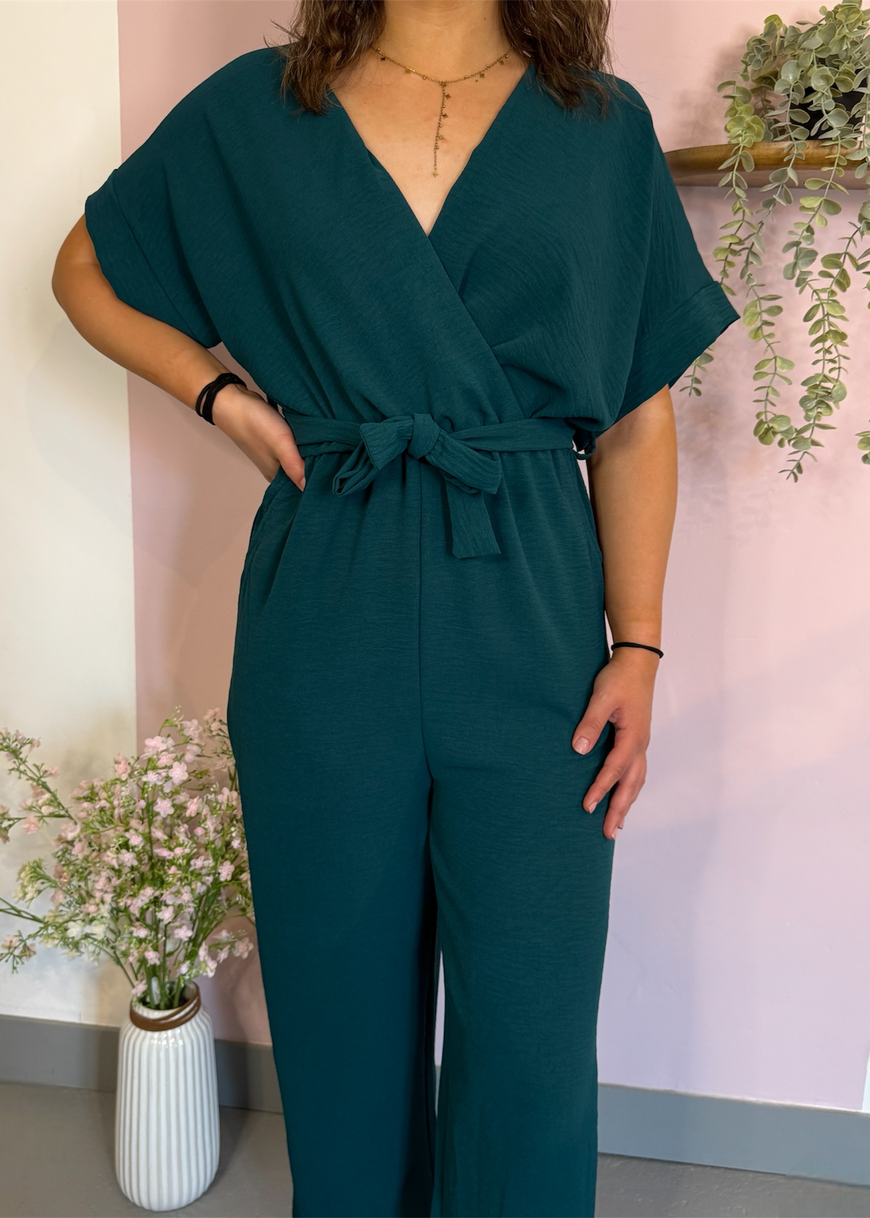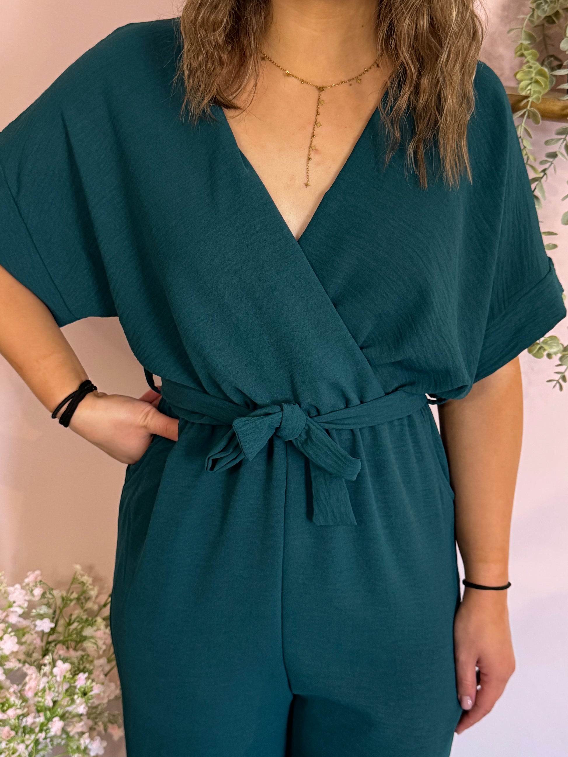 Combinaison taille unique (34-38) en bleu pétrole, élégante et profonde. Cordon à la taille pour souligner la silhouette et poches pratiques pour un look chic et confortable.
