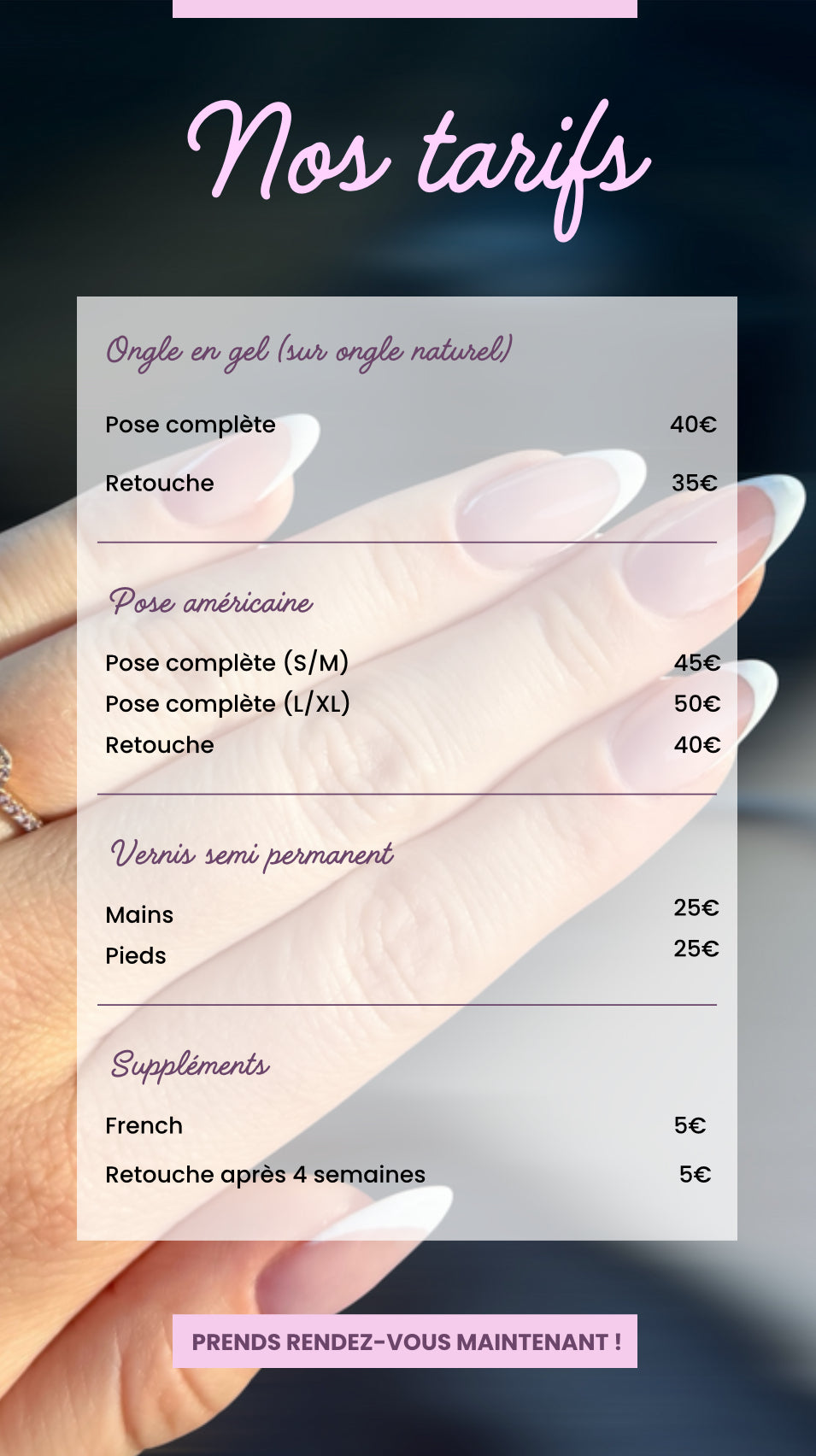 Envie d’ongles soignés, élégants, ou originaux ? Je vous accueille chez moi, dans un espace cocooning, pour un moment de détente et de bien-être. Que vous aimiez les looks naturels ou plus audacieux, je suis à l’écoute de vos envies et vous conseille selon vos goûts et votre style.