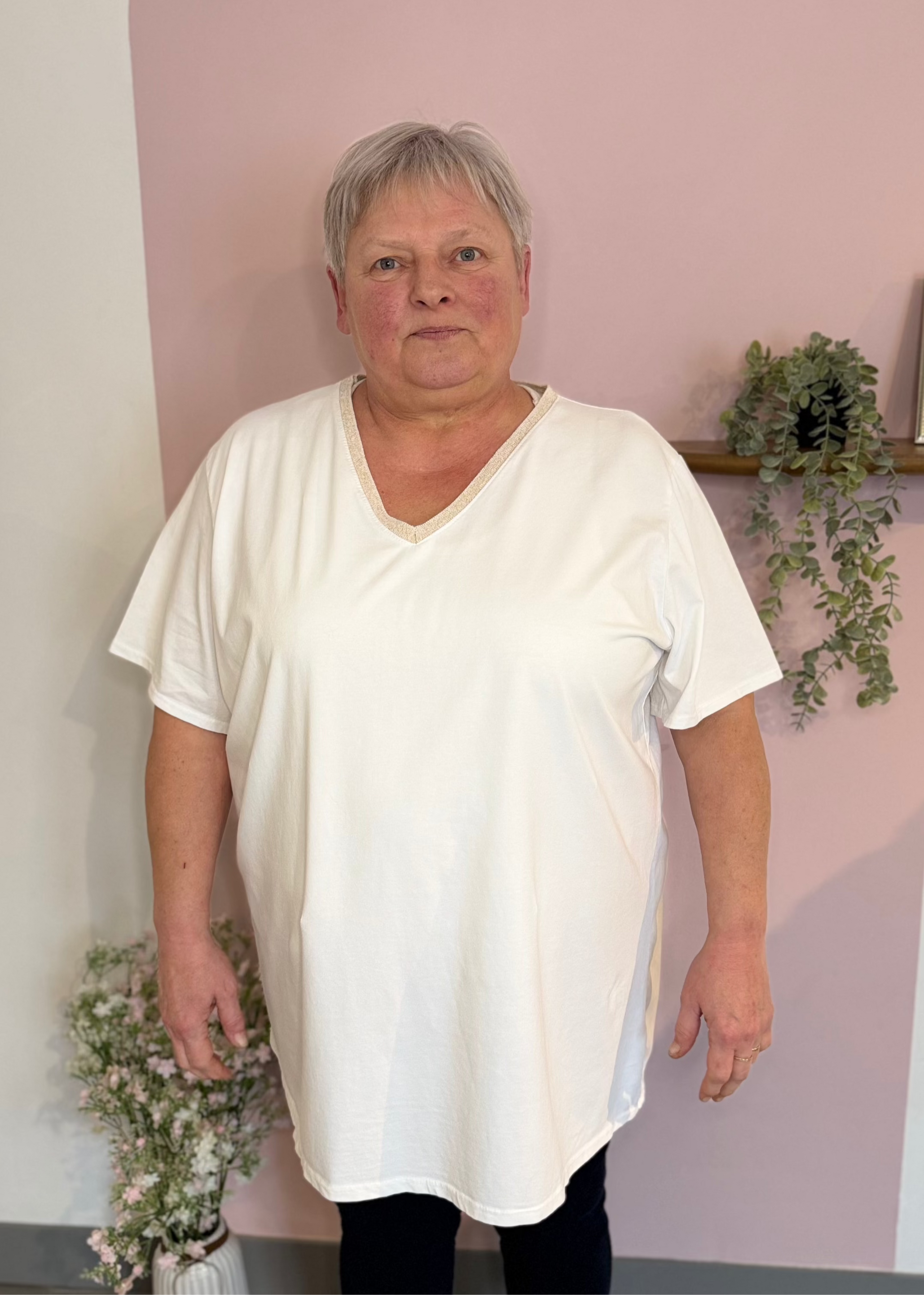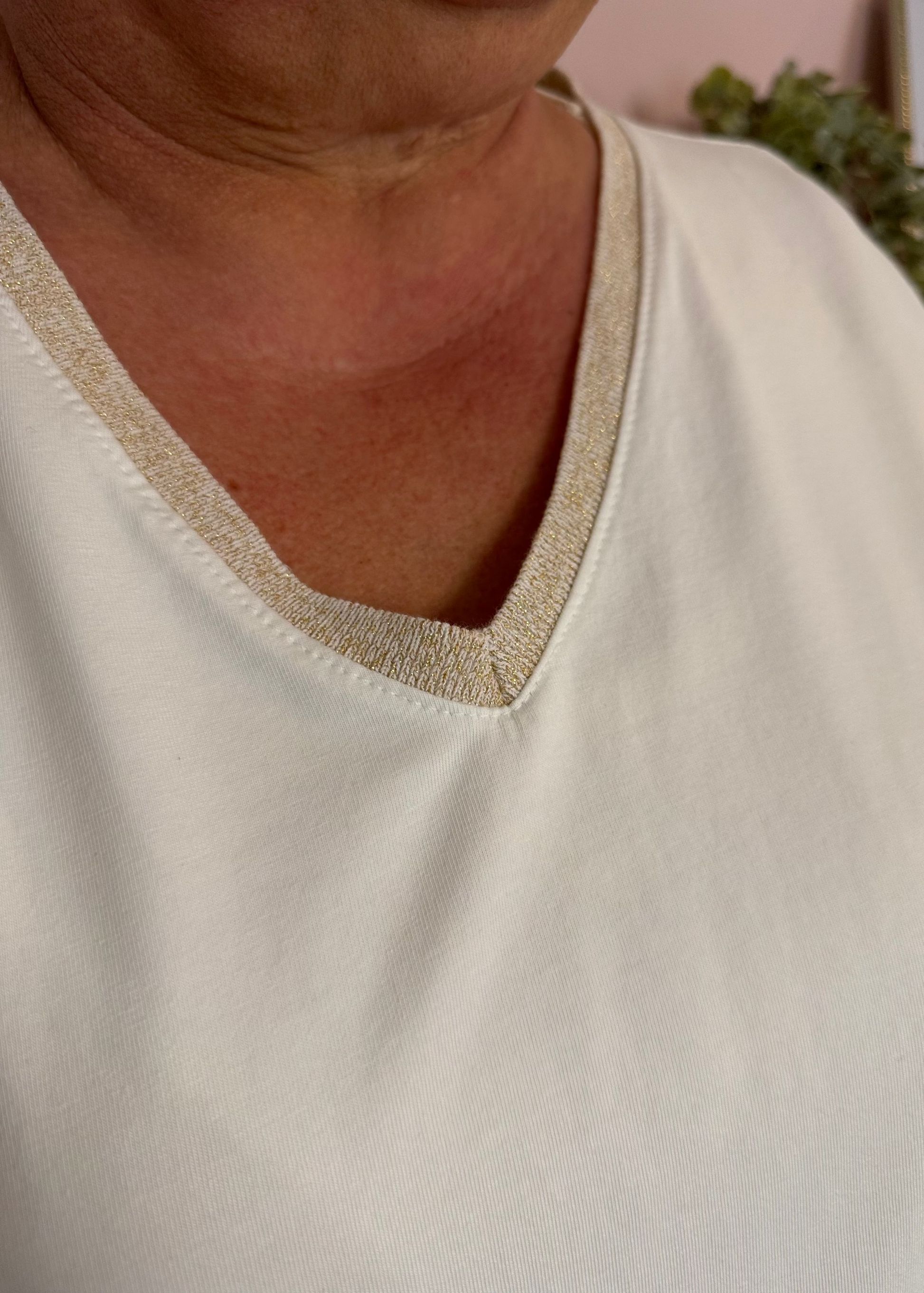 Un t-shirt confortable et féminin, sublimé par un col V orné de paillettes pour une touche brillante tout en subtilité.